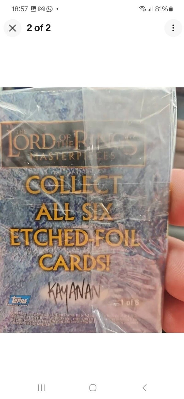 This is a rare and highly sought-after set of Lord of the Rings Masterpieces etched foil cards. The set includes six cards featuring iconic characters such as Gollum, Gandalf the Grey, and Bilbo Baggins. These cards are a must-have for any serious collector of non-sport trading cards.