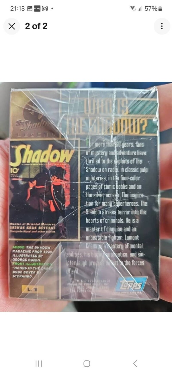 This is a 1994 Topps The Shadow Legend non-sport trading card set featuring the character Shadow. The set includes 10 cards made of card stock and is standard sized. The cards are in English language and manufactured in the United States by Topps.